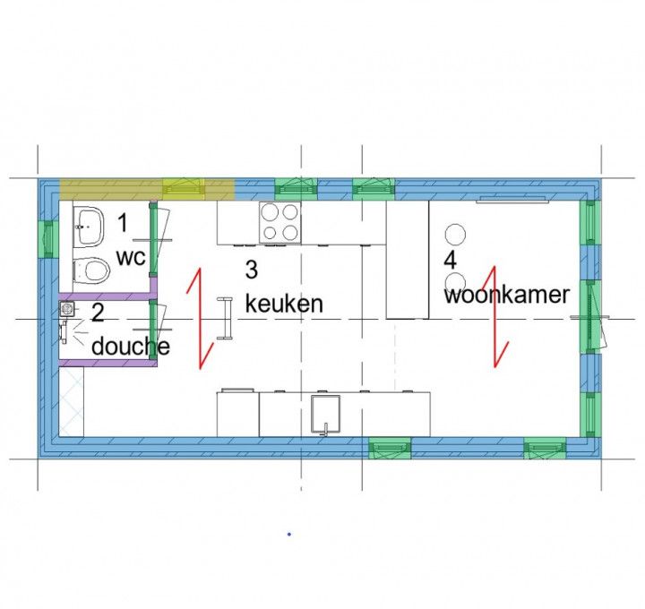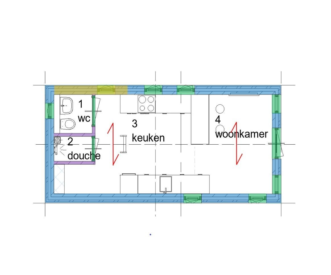 Een Tiny House blijft niet uit zichzelf staan. Daarom is het erg belangrijk om te kijken naar de constructie. Je kijkt eerst naar de verschillende bouwdelen. In deconstrucitie-opzet zijn de dragende muren, niet-dragende muren, overspanningsrichtingen, lateien en de maatgevende latei te zien.