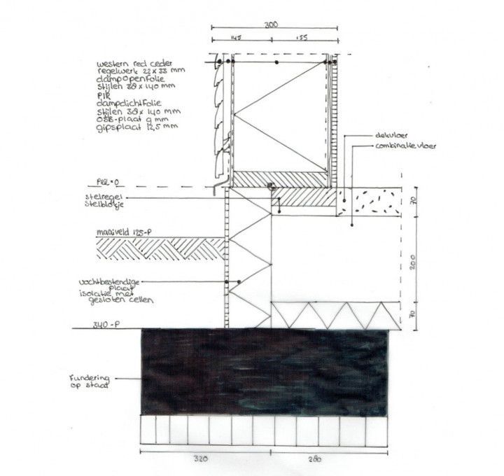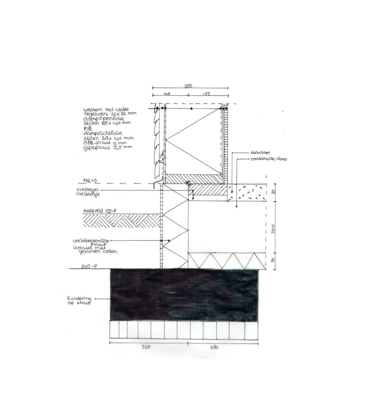 In de detailtekening is te zien hoe de begane grondvloer op de fundering aansluit. De onderdelen die bij elkaar komen in het betreffende knooppunt zijn: fundering, begane grondvloer en de buitenwand.
