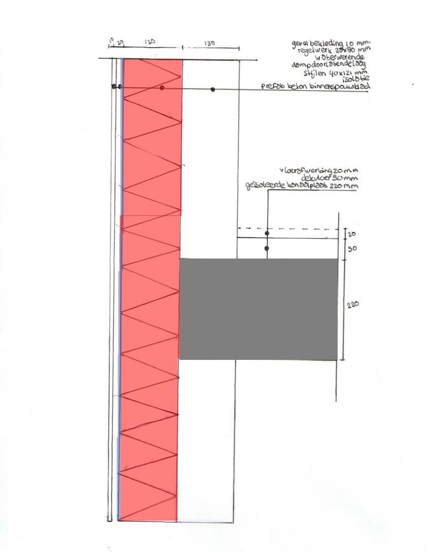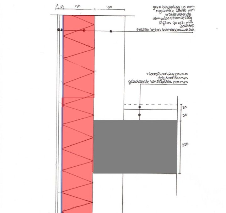 Tot slot maak je ook twee detailtekeningen waarbij je de warmte-isolatie en de waterkering aangeeft. Op het eerste detail wat je maakt is te zien hoe de gevel en vloer aansluiten op de fundering. De aansluiting van de verdiepingsvloer op de gevel is het tweede detail wat je maakt.